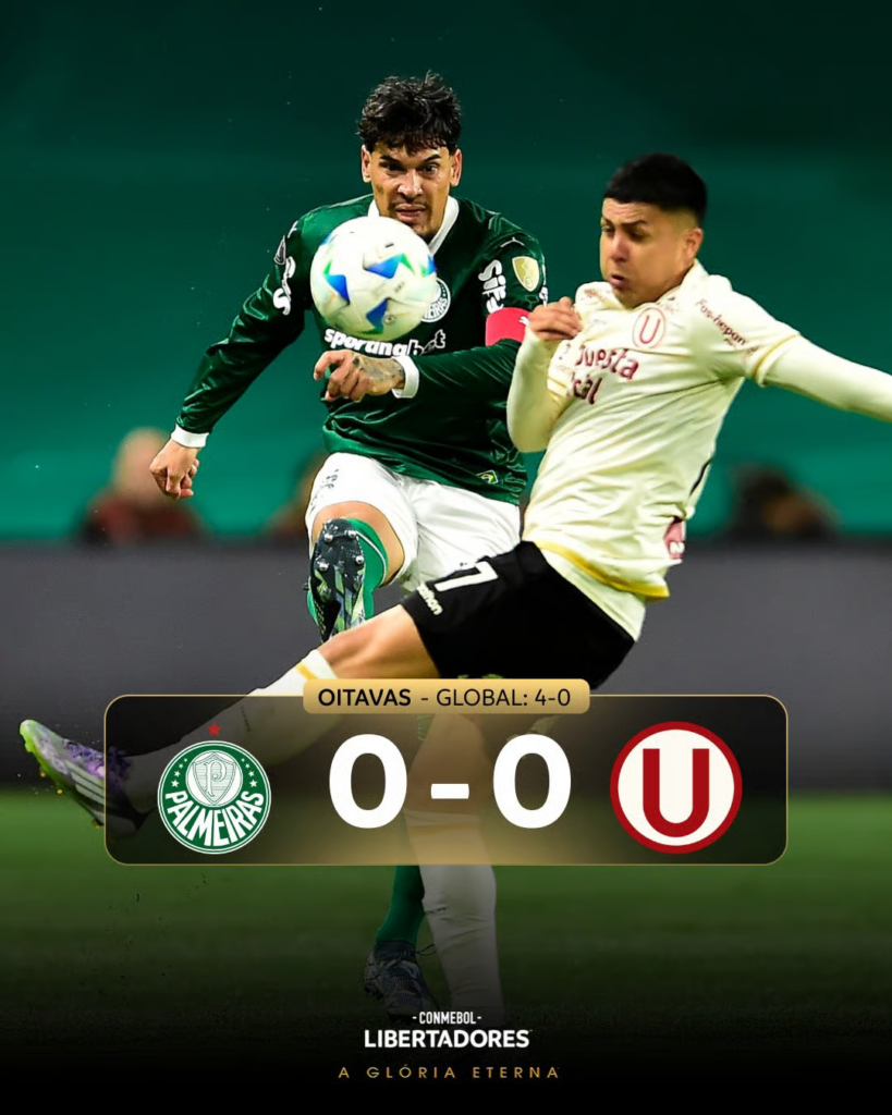 Após aplicar 4 a 0 no estádio da final, em Lima, o Verdão começou em ritmo mais lento e viu o Universitario-PER ter um gol anulado logo aos 8’, após Pérez atrapalhar a visão de Weverton.