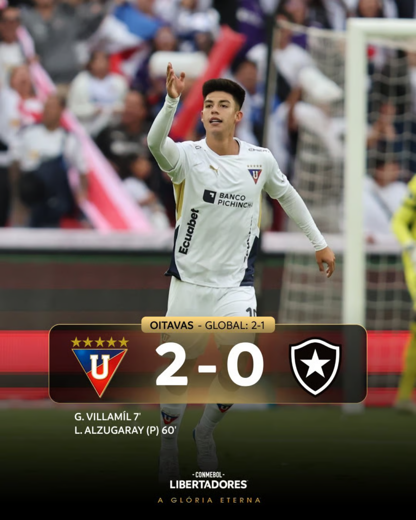 Villamíl abriu o placar cedo, aos 6’ do 1T (são não tão cedo quanto o Fogão, na ida). No 2T, Alzugaray marcou de pênalti e garantiu a classificação para os equatorianos.