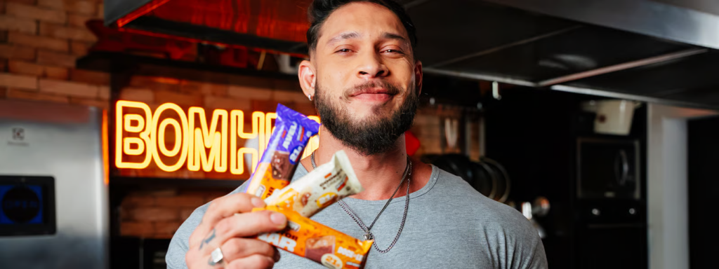 E por trás dos 1,81 m e mais de 100 kg, existe disciplina, rotina e… isso aqui — que é o pré ou pós-treino ideal com um sabor difícil de explicar em palavras — é bom, hein?